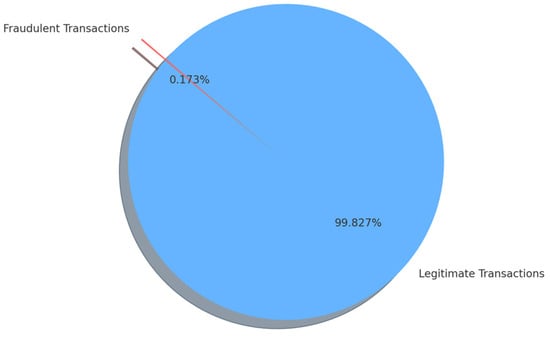 The publicly available “Credit Card Fraud Detection” dataset from Kaggle was used in this research, which consists of 284,807 transactions in total, with just 492 of them labeled as fraudulent; the fraud rate turns out to be highly imbalanced, at 0.172%. Each transaction is represented by 31 attributes, of which 28 anonymized features V1–V28 were derived using Principal Component Analysis and two non-transformed features, “Time” and “Amount”. The binary “Class” attribute is the target variable, where 1 denotes fraud, and 0 denotes a legitimate transaction. The PCA transformation maintains privacy while retaining essential feature representations for fraud detection.