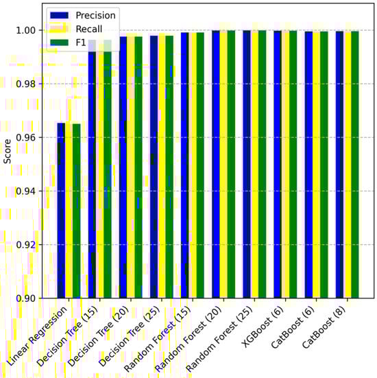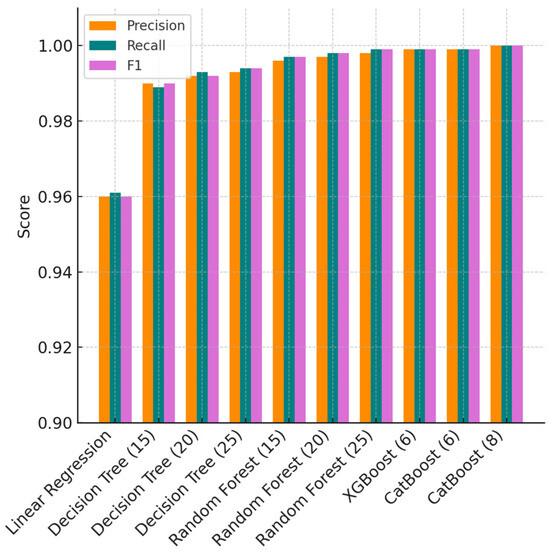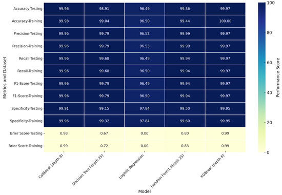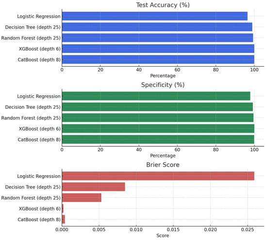 The Brier Scores of the models comprising Logistic Regression, Decision Trees, Random Forest, XGBoost, and CatBoost were computed in order to assess the probabilistic accuracy and calibration of these various techniques. For this comparison, CatBoost showed promising performance for both depth levels of 6 and 8, achieving a test Brier Score of 0.0004 at depth 8, thus outperforming most of the other models in calibration and probabilistic accuracy on imbalanced datasets, and being very close to XGBoost, which achieved a Brier Score of 0.0002. MCS confirmed that, at a confidence level of 95%, the model CatBoost was statistically equivalent in its predictive ability compared to models XGBoost and Random Forest. At the same time, CatBoost showed better calibration than XGBoost for settings. Figure 8 below visualizes the Brier Score for each evaluated model, where lower values represent better-calibrated probabilistic predictions.