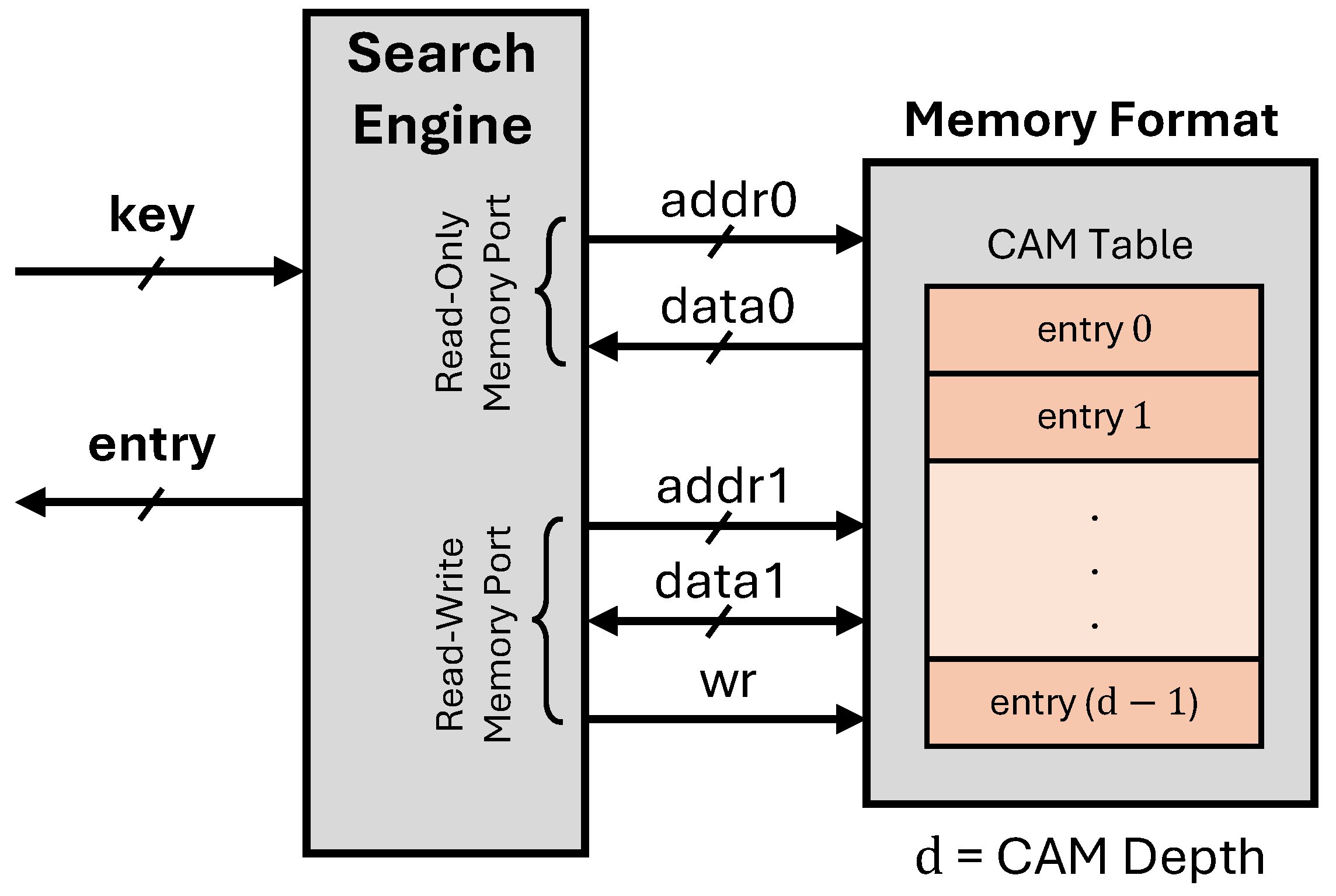 Figure 2 illustrates the hardware structure of the proposed CAM lookup in BF mode. The search engine is responsible for sequentially reading each entry and executing the required comparison and matching operations, depending on the CAM type. The allocated memory space consists of a single memory module with two ports for the entire CAM table. The first port is dedicated to read-only operations, while the second port supports both read and write functions.