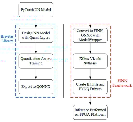 In our proposed quantization method, models with both high- and low-precision quantization are derived through the workflow depicted in Figure 2 and ultimately deployed on FPGA devices. The workflow consists of two main stages: quantization-aware training based on the Xilinx Brevitas library, and model conversion and deployment based on the FINN framework [32].