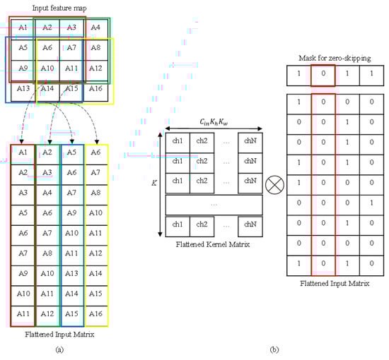 Diagram of the zero-skipping computation method. (a) Im2Col operation; (b) zero-skipping mask generation.
