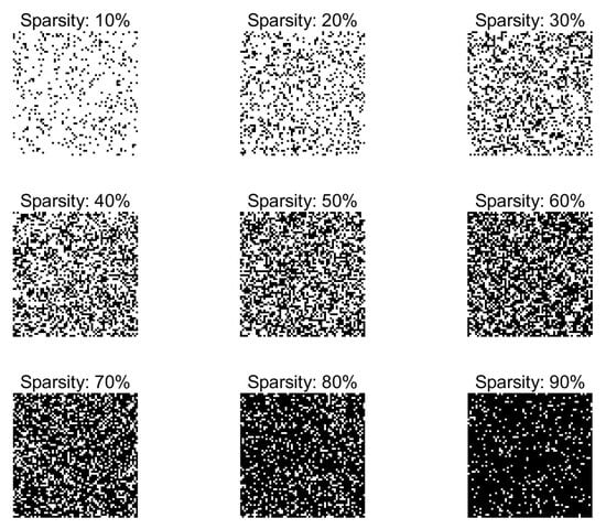 The input data consisted of 64 × 64 binary matrices, with sparsity (i.e., the proportion of elements that are zero) incremented from 10% to 90% in increments of 10%. The effectiveness of the zero-skipping acceleration method was verified by measuring the computation time of the model for input matrices with varying levels of sparsity. The input matrices with different sparsity levels and their corresponding computation times are illustrated in Figure 4 and Figure 5. Specifically, as the sparsity increases from 10% to 90%, the computation time gradually decreases from 1.20 × 10−4 s to 3.86 × 10−5 s for the single-layer CNN and from 1.01 × 10−3 s to 5.82 × 10−4 s for the Dn-CNN. These results demonstrate that the zero-skipping acceleration method can significantly reduce the computational load for highly sparse input data, thereby significantly improving model inference speed.