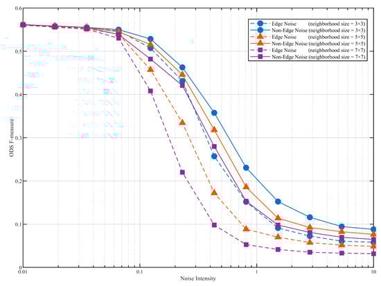 First, we verified whether the image edges and their neighborhoods serve as sensitive areas affecting model accuracy in the joint deblurring and edge detection task. To simulate quantization errors, we added random noise with intensities ranging from 0.01 to 10 to the test images of the blurred image edge detection dataset. Based on the locations where the noise was added, the noisy images were categorized into two types, as shown in Figure 7: one type consisted of images with noise added to the ground-truth edges and their m × m neighborhood, while the other type comprised images with the same amount of noise added to regions outside the ground-truth edges and their m × m neighborhood.