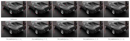 During accuracy evaluation, the deblurring of the test set images was completed on the development board, followed by consistent Canny edge detection to obtain edge detection results. Figure 9 illustrates the deblurring results obtained using various methods. The top panel presents the deblurring outcome of the original full-precision model, while the subsequent panels display the performance of models quantized by CalibTIP, ZeroQ, MPDNN, and HAWQ-V3. In addition, the lower panels reveal the performance variation in the proposed quantization method with increasing edge neighborhood sizes from 3 × 3 to 11 × 11. Figure 10 correspondingly presents the edge detection results for the aforementioned models.