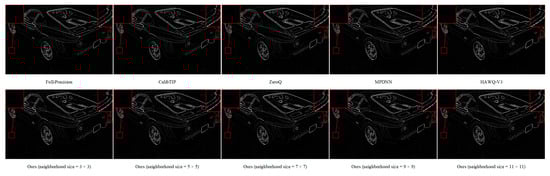 In the accuracy evaluation, among the four comparative methods, HAWQ-V3 achieved the highest edge detection accuracy, reaching 96.84% of the baseline value. By contrast, our proposed method attained accuracy levels of 97.54%, 97.91%, 98.11%, 98.18%, and 98.23% of the baseline under neighborhood sizes of 3 × 3, 5 × 5, 7 × 7, 9 × 9, and 11 × 11, respectively. The accuracy increased as the neighborhood size grew, aligning well with our expectations. Across all neighborhood sizes, our method consistently outperformed the other methods, owing to the high-precision quantization strategy employed for edge neighborhoods, which preserved more edge information.
