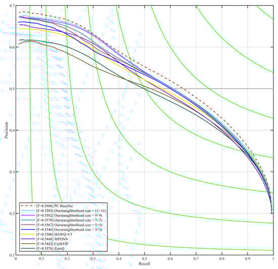 We used the ODS F-measure of 0.5686, obtained from the model running on a PC as reported in [35], as the baseline, and recorded the percentage of this value achieved by the quantized models on the FPGA board. The edge detection results of all the quantization methods on the test set are presented as precision–recall curves in Figure 11. Their quantitative accuracy (ODS F-measure) and average processing time per image across the entire test set are summarized in Table 1.