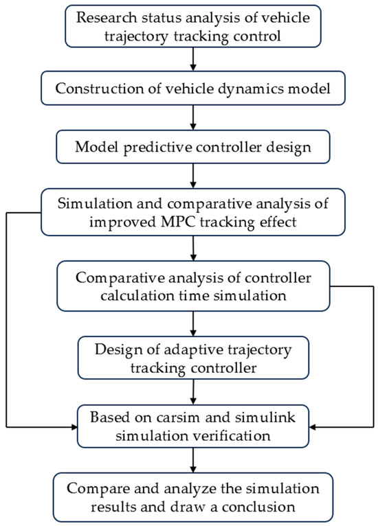 Based on this, an adaptive MPC trajectory tracking control method with a variable prediction horizon is proposed in this paper. The overall logical framework for the article is shown in Figure 1. The main contribution of this paper: Based on the improved design of the ordinary MPC controller, the computational efficiency of the model prediction controller is improved, and the prediction horizon is updated according to the real-time vehicle speed on the premise of meeting the vehicle trajectory tracking accuracy and stability so that the vehicle can maintain good adaptive performance at different speeds.