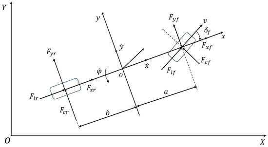 In Formula (1), m is the vehicle maintenance mass, the unit is kg; a and b are the distances between the vehicle’s center of mass and the front and rear axles, respectively, in unit m; φ and φ ˙ are the yaw angle and yaw speed of the vehicle, in units rad and rad/s, respectively; δ f is the front wheel steering Angle, the unit is °; Iz is the moment of inertia of the vehicle around the z axis, and the unit is kg⋅m2. X ˙ and Y ˙ are respectively the transverse and longitudinal velocity of the vehicle in OXY coordinate system, x ˙ and y ˙ are respectively the longitudinal and lateral velocity of the vehicle in oxy coordinate system, in unit km/h; Ccf and Ccr are the lateral stiffness of front and rear wheels, respectively. The unit is N·rad−1. Clf and Clr are the longitudinal stiffness of the front and rear wheels, respectively, expressed in N⸳m−1. Sf and Sr are the slip rates of the front and rear wheels, respectively.