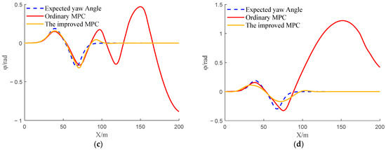 The simulation results of 30 km/h and 60 km/h trajectory tracking are shown in (a) and (b) in Figure 3. Due to the low speed, the tracking process is relatively stable, the overshoot is small, and the trajectory tracking deviation is small. It can be seen from (a) and (b) in Figure 4 that the fluctuation of the yaw Angle is also within a reasonable range. Compared with the ordinary MPC, the improved vehicle has better stability. It can be seen from (c) and (d) in Figure 3 that with the increase in vehicle speed, when the vehicle speed is 80 and 100 km/h, the ordinary MPC fails to track at the longitudinal displacement of about 90 m. However, although the tracking error of the improved MPC at 40–90 m is slightly larger than that at low speed, it can still track the desired trajectory after 90 m. It can be seen from (c) and (d) in Figure 4 that the yaw Angle of the ordinary MPC fluctuates greatly after the longitudinal displacement of 80 m, putting the vehicle in a dangerous state. In the process of the change of the yaw Angle of the improved MPC, the oscillation amplitude is weakened, and the MPC is more stable, with better tracking accuracy and stability. Through the analysis of the above simulation results, the effectiveness of the improved MPC controller is verified.