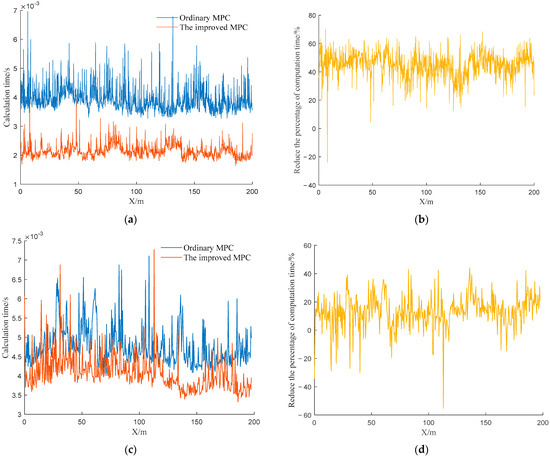 Through simulation tests, the calculation time of the controller and the percentage reduction of calculation time are shown in Figure 5. It can be seen from (b) and (d) that the calculation efficiency of the controller is higher when the vehicle is at low speed than at high speed, and the calculation time of the improved controller is shorter, and the calculation performance is significantly improved. However, there are still some time points in the simulation process that take longer to calculate than the ordinary model prediction controller. The reason is that the change of step length in the horizon leads to the influence of the rolling optimization results at the previous time on the rolling optimization results at the next time and thus affects the calculation and solution time. It can be seen from Table 2 and Table 3 that the average calculation time of the improved MPC controller at low speed and high speed is 2.15 ms and 4.08 ms, respectively, and the maximum single calculation time is 4.29 ms and 7.10 ms, respectively. The average calculation time of an ordinary MPC controller is 3.94 ms and 4.76 ms, respectively, and the maximum single calculation time is 6.96 ms and 7.27 ms, respectively. Compared with the conventional MPC controller, the average calculation time of the improved MPC controller is reduced by 45.43% and 14.29% at low speed and high speed, respectively, and the maximum single calculation time is reduced by 38.36% and 2.34%.