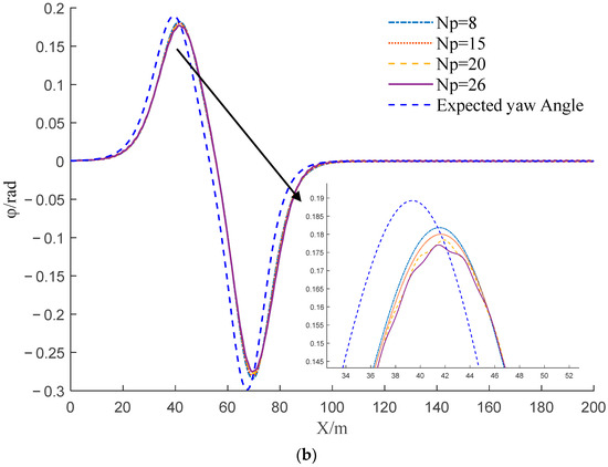 Figure 6. Influence of vehicle speed and prediction horizon on trajectory tracking control effect: (a) Comparison of tracking trajectory simulation results in different prediction horizons (v = 30 km/h); (b) Comparison of simulation results of yaw Angle in different prediction horizons (v = 30 km/h).