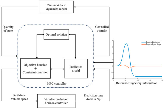 Based on the above stability analysis, the control strategy for real-time optimization of prediction horizon parameters is given, as shown in Figure 8. According to the changes of the initial state of the vehicle and the future reference trajectory information, it is input into the model prediction controller; the controller generates the control quantity and inputs it into the CarSim vehicle model to control the trajectory tracking of the vehicle, and the CarSim vehicle model feeds back the state quantity to the prediction horizon controller. The predictive horizon controller estimates the vehicle dynamics parameters online, adjusts the controller parameters in real time, updates the prediction horizon online, determines the corresponding prediction horizon values, and generates the optimal control input to the MPC model predictive controller, thus forming an adaptive trajectory tracking controller based on the variable prediction horizon.
