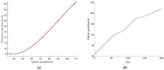 Figure 9. (a) Corresponding the prediction horizon Np under different vehicle speeds; (b) Changes in vehicle speed.