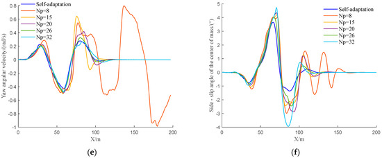 The simulation results under variable speed conditions are shown in Figure 10. It can be seen from (a) and (b) that when the prediction horizon Np is equal to 8, the vehicle speed continues to increase, and the longitudinal displacement is about 80 m. At this time, the vehicle dynamic characteristics change greatly, which can no longer meet the constraint requirements, resulting in the failure of tracking the expected trajectory and expected yaw Angle at the exit under the double-shift condition. When the prediction horizon is large, the tracking accuracy is poor, and the adaptive vehicle can accurately track the reference track. Although the yaw Angle deflects with the increase in speed, it can quickly adjust and converge to the expected value. Through the analysis of (c) and (d), it can be seen that when the prediction horizon Np is equal to 8, the vehicle tracking failure leads to large lateral error and heading error, and the adaptive vehicle tracking lateral error is the smallest, and the corresponding heading error is small. The heading error in the prediction horizon of 32 is the smallest at medium and high speeds, but the tracking lateral error is larger. This also indicates that the vehicle stability is better when the prediction horizon value is large at high speed, but the tracking lateral error will be larger. According to (e) and (f), it can be seen that when the prediction horizon Np is small, the yaw velocity will fluctuate greatly; when the prediction horizon Np is equal to 8, the vehicle will become seriously unstable; when the prediction horizon Np is large, the vehicle will have good stability; and the changes of the lateral declination Angle and yaw velocity of the vehicle’s center of mass are smooth and natural using adaptive methods, indicating that the vehicle trajectory tracking process is stable.