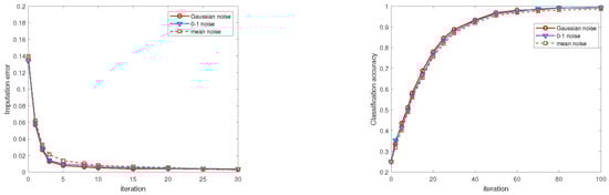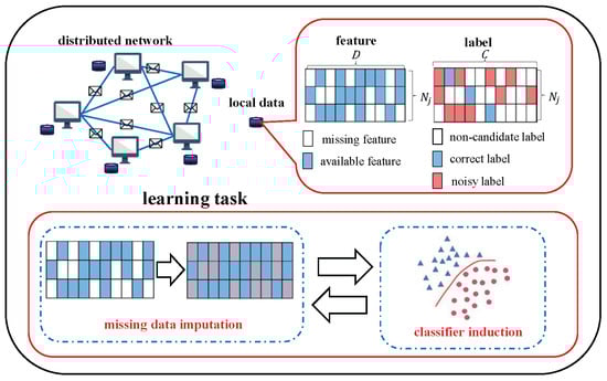 For these DL algorithms, having a sufficient number of high-quality data with complete features is a precondition for obtaining satisfactory learning performance. However, due to various causes, such as absent features or acquisition failures, the collected data vectors often contain a certain number of missing features [6]. A lack of high-quality data can degrade classification performance. Recent years have witnessed some efforts to tackle this problem. Most current missing data classification (MDC) methods address the tasks of missing feature imputation and predictive model induction independently. To be specific, they firstly utilize some imputation methods, including mean imputation [11], knn imputation [12,13], logistic regression imputation [14], and auto-encoder imputation [15,16,17], to induce an imputed model to fill in the missing features in the early stage and then learn the classifier based on the recovered features. Although extensive experiments have shown that these data imputation methods can boost learning performance to some extent, a certain amount of training data is complete features and precise labels are required during the induction of the imputed model, which may be infeasible in many real applications. In addition to the above methods, in the literature [18,19,20], a probabilistic generative model was designed to seek the optimal completion solution based on the learned model. For such a method, although a complete data sample was not required to learn the imputation model, the missing features of some training data needed to be pre-imputed before training the classifier. Since the accuracy of pre-imputation is heavily dependent on accurate supervision information, it is difficult to obtain good learning performance when a large amount of training data is unlabeled or ambiguously labeled. Another strategy suggested in [21] was to lessen the negative impact of missing features on classification performance by reducing the importance of training data that have many missing features. However, this method does not consider the information about data distribution when evaluating the weight of training data, which may lead to the degradation of the induced classifier’s performance. Lately, a few novel MDC methods have been proposed [6,22,23], which jointly address the tasks of missing feature imputation and classifier induction in an integral framework. These MDC approaches usually require accurate label information to impute missing features and induce classifiers, which includes an underlying assumption that all the available labels of incomplete data are error-free. However, this assumption is not valid in many scenarios.