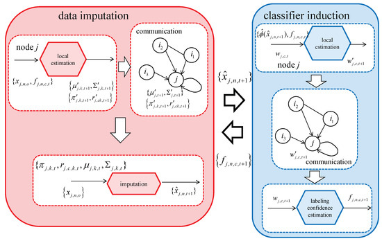 Jointly taking the above consideration into account, in this article, as shown in Figure 1, the problem of distributed classification of partially labeled incomplete data is considered. For this study, an integrated framework was designed that could address jointly the tasks of missing feature imputation and predictive classifier induction over a network. Specifically, the main contributions of this paper are summarized as follows: