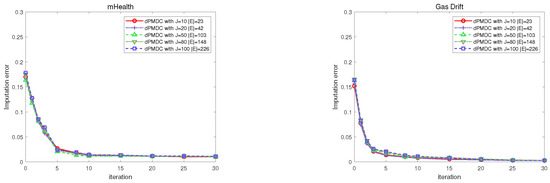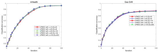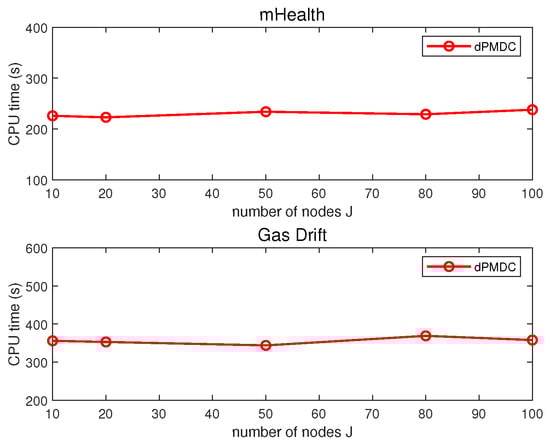 Finally, we evaluated the CPU time of all the considered algorithms on the ten used datasets, shown in Table 11. It should be noted that for the distributed learning algorithms, all the computation operations were performed at the J node over a network. For centralized learning algorithms, all the computation operations were centralized at a single fusion node. Owing to the distributed parallel computation, the CPU times of all the distributed learning methods were significantly lower than those of the centralized learning methods. Compared with im-dS2PLL, our proposed dPMDC and the dS2MDC required fewer computations during the process of imputation model induction. Therefore, the CPU times of the proposed dPMDC and dS2MDC were significantly shorter than those of im-dS2PLL.