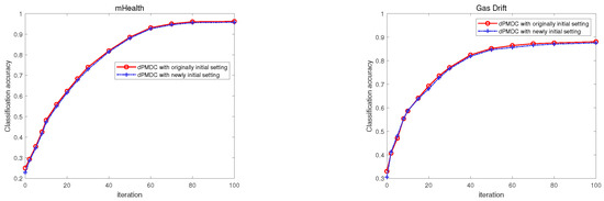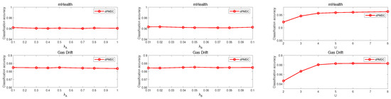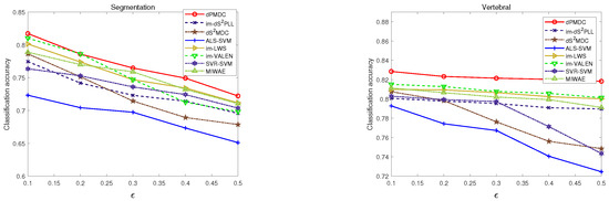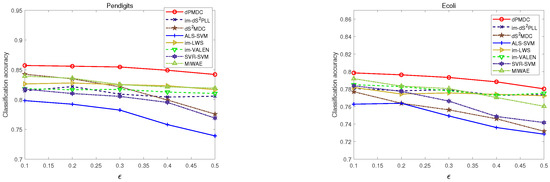 To testify to the robustness of the proposed algorithm against coupling noisy labels, we compared the classification accuracy of the comparison algorithms versus on four artificial PLL datasets (Pendigits, Ecoli, Segmentation, and Vertebral datasets). From Figure 14 and Figure 15, we can see that as the probability of co-occurring between the correct label and another coupling noisy label gradually increased, the classification performances of all the considered algorithms gradually deteriorated. Among all the comparison algorithms, we found that our proposed algorithm demonstrated superior performance, especially when the value of was smaller than 0.3. When the proportion of coupling noisy labels was larger than 0.3, the performance significance of the dPMDC algorithm gradually reduced. Such a simulation result validates the benefits of our proposed algorithm in handling a small amount of coupling noisy labels.