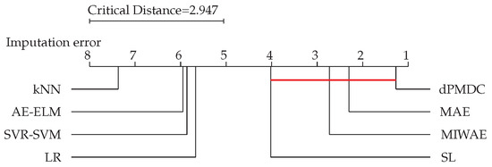 The comparison algorithms whose average ranks fell within one CD compared to the controlled algorithms at a significance level of 0.05 and a critical difference (CD) of performance are connected by red lines. Otherwise, no line links them. Figure 12 illustrates that our suggested method achieved the highest ranking among all comparative algorithms. Furthermore, the results of the Bonferroni–Dunn test demonstrated that the performance of our proposed method was significantly superior to that of the LR, AE-ELM, SVR-SVM, and kNN imputation methods.
