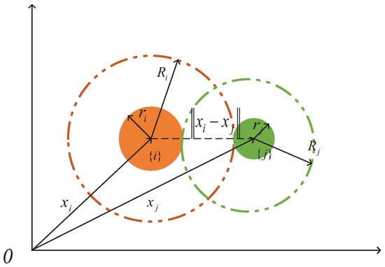 In practice, since each agent has a limited communication range, neighboring agents must remain within their common communication radius during operation. At the same time, no collision should occur between the agents during the movement toward the desired formation. In general, to solve these two problems, we assumed that each agent is surrounded by a small circular safety region, and a large circular communication region. As shown in Figure 1, and denote the positions of the i-th and j-th agents, and and denote the safety regions of the two agents, respectively. and denote the communication ranges of the two agents, respectively.
