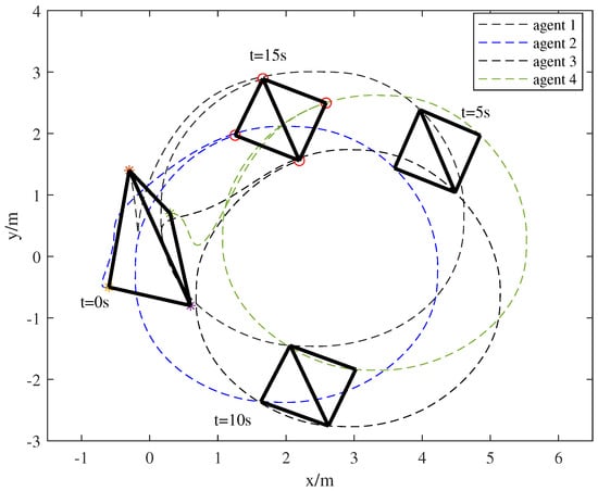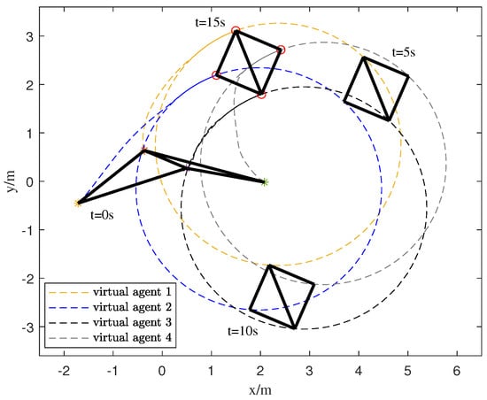 Figure 2 illustrates the trajectories of the four virtual agents under the control of the proposed signal generator. Starting from their respective initial positions, the agents progressively converged to the desired formation. Throughout the simulation process, safe distances were maintained between the agents, which ensured collision avoidance and connectivity maintenance, and thus, demonstrated the effectiveness of the proposed formation control method.