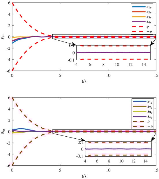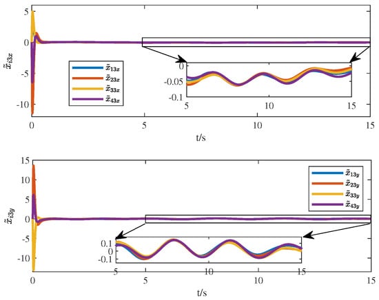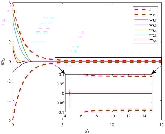 Figure 6 presents the tracking errors of the actual agents relative to the reference trajectories, which remained strictly within the predefined performance bounds. Initially, significant errors diminished rapidly, where they eventually stabilized near zero. This indicates that the designed tracking controller effectively enforced the prescribed error constraints to ensure a high tracking accuracy.