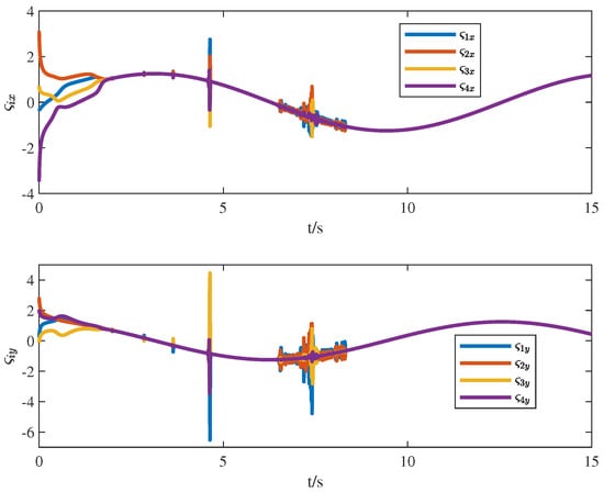 We assumed that the initial position state of each robotic arm was chosen as , , , and , and the velocity states were all set to zero. The parameters of the PPF, FTESO, and controller were chosen as ; ; ; ; ; ; ; ; and .