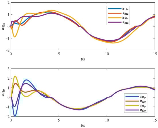 The trajectories of the actual agents (robotic manipulators) are presented in Figure 5, depicting their responses to the reference trajectories provided by the virtual agents. The actual agents exhibited stable convergence toward the desired formation configuration, where they accurately replicated the reference trajectories. This outcome highlights the precision and efficacy of the proposed tracking control strategy for real nonlinear systems.