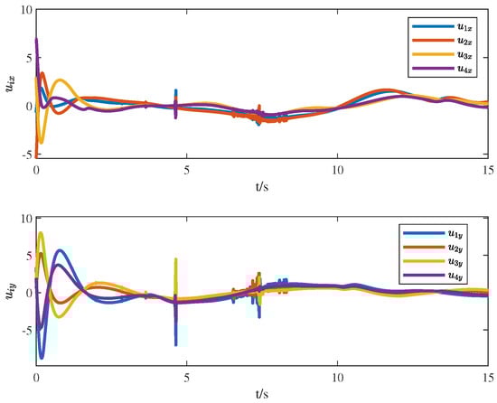 Figure 9 illustrates the control inputs applied by the tracking controller to the actual agents. Initially, the control inputs exhibited stronger actions to promptly eliminate the tracking errors, which gradually reduced in magnitude to stabilize at steady-state values. The smoothness and bounded nature of the control signals demonstrate the stability and robustness of the proposed control strategy, enabling precise trajectory tracking for actual agents.