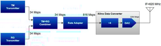This section details the architectural solution for the SCCC + PN-Ranging transmitter, which is composed of two distinct transmitters that are later combined to the generate the output waveform. The first one generates an SCCC telemetry signal at eight times the symbol rate using the CCSDS 131.2-B Intellectual Property (IP) Core developed by IngeniArs S.r.l. [14] (Pisa, Italy). The main goal of this initial prototype was to validate the findings of previous theoretical studies and to address limitations stemming from genie-aided assumptions used in those works. Given the exploratory nature of the activity and the limited budget allocated by ESA, the system was intentionally required to implement a simplified configuration of data rates. In particular, only a single set of symbol and chip rates was implemented to reduce overall complexity and development effort. The chosen telemetry symbol rate was 4.25 Mbaud, corresponding to a 34 Msps output rate at the telemetry transmitter. This value was selected based on earlier considerations related to the 10 MHz bandwidth constraint, as discussed in [12,13]. Operating in parallel, the second transmitter generates the PN-Ranging signal by producing the PN sequence and applying phase modulation at the same output sample rate as the telemetry signal (i.e., 34 Msps). The two generated signals are then combined through a complex multiplier, producing the simultaneous TM + RG signal. This combined signal is then forwarded to the output interface, which includes an up-sampler to 816 Msps and the Xilinx DAC interface [15] (clocked at 3264 Msps). The adoption of such a high sample rate was necessary to enable direct RF synthesis at carrier IF = 620 MHz, similar to IFs of actual ground stations, such as ESA TTCP.