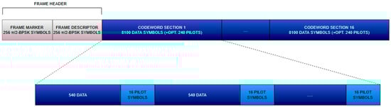 This structure enables the telemetry receiver to reconstruct the position of data blocks for the decoder while supporting data-aided algorithms for impairment recovery as well, a crucial aspect when using high-order modulations such as 16-APSK and beyond [16]. Moreover, this structure facilitates the implementation of VCM or ACM techniques by leveraging the header data embedding the ModCod value. This value informs the receiver about the coding scheme applied to the data payload, enabling dynamic adaptation to channel conditions.