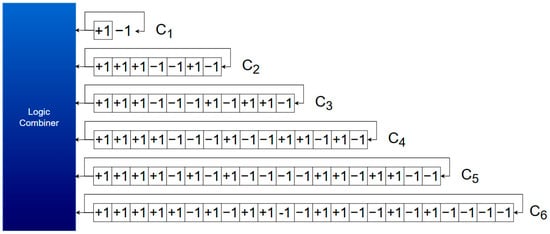 The transmitter operates based on the chip sequence c(t), generated in accordance with the recommendation in [8], which specifies the use of T2B and T4B codes. Both sequences share the same six-component binary structure, implemented using linear-feedback shift registers (LFSRs). The outputs of these registers are combined according to the selected code type using a simple weighting function, which can be easily adjusted at runtime. Figure 5 illustrates the structure of the T2B and T4B sequence generators as defined in the standard and implemented in the breadboard.