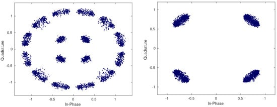 TM constellations before ranging cancellation (16-APSK and QPSK).