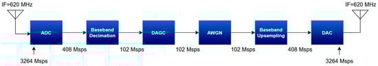 Finally, the signal is up-sampled back to 408 Msps using a pair of half-band filters, designed similarly to the input ones. The sample rate is then further up-sampled by a factor of eight using the internal interpolators embedded in the Xilinx Data Converter blocks [15]. This process restores the sample rate to the channel emulator’s original input rate of 3264 Msps, which is appropriate for up-conversion to the 620 MHz intermediate frequency. Since both the input ADC and output DAC clocks are derived from the same source, no timing drift impairment is introduced during this process.