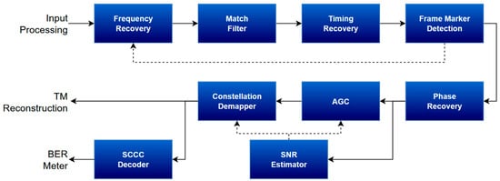 The telemetry receiver submodule is based on the SCCC-RX for science projects, developed by IngeniArs S.r.l. [17,18], the architecture of which is depicted in Figure 10, including internal loops and uncoded/coded output separation as well.