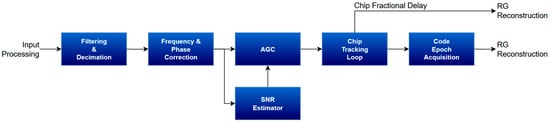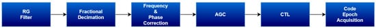 Following the removal of the telemetry signal, the system proceeds with processing the ranging signal. The first main stage involves sample rate adaptation to an integer multiple of the chip rate. This is followed by chip timing recovery and code epoch detection, which are key steps before reconstructing the ranging signal for subsequent cancellation on the telemetry branch. The general architecture of the ranging receiver is illustrated in Figure 11. In addition to the core processing stages, the design incorporates automatic gain control blocks and frequency/phase correction loops. These components are essential for ensuring a stable and reliable signal before it reaches the subsequent blocks responsible for resolving the sampling timing and tracking of T2B/T4B code.