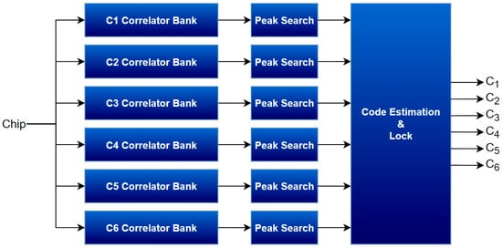After integration, code acquisition is performed using correlator banks to align the sub-codes that constitute the ranging sequence. The receiver employs six correlator banks, each containing at least two sub-correlators (i.e., as the positions in Figure 5). Given the resource flexibility of ground-based architectures, all 77 sub-correlators (i.e., one for each sub-code and phase shift [8]) operate in parallel, minimizing acquisition latency.