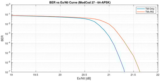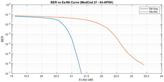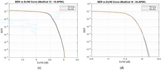 The ModCod identification is then performed by the Descriptor Decoder module, which operates using a maximum likelihood algorithm to search for all possible values of the Frame Descriptor field within the PL frame [4,21]. The module declares the ModCod as the one yielding the highest correlation among all possible combinations. For SNR estimation and AGC, the architecture follows the approach presented in [21], with the added requirement that the amplitude correction applied by the AGC is forwarded to subsequent modules for use during the telemetry reconstruction phase. Specifically, the gain applied at the input within the timing recovery loop must be multiplied by the gain applied by the AGC before the symbol de-mapper and append it as side information to the data stream. Finally, constellation de-mapping is performed to derive Log-Likelihood Ratios (LLRs) and related hard-decision bits for the telemetry reconstruction. Meanwhile, the LLRs are also forwarded to the SCCC decoder, which is used to generate BER curves for system performance evaluation, as shown in Figure 9.