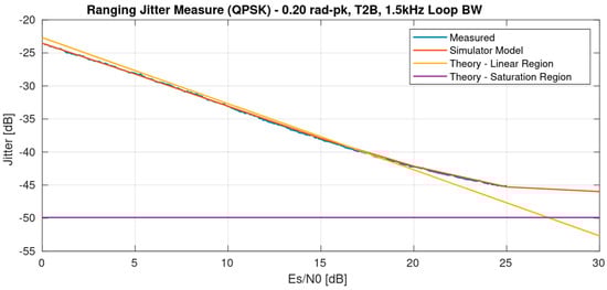 The resulting jitter measurements are illustrated in Figure 18, where they are compared to the theoretical curves for the linear region (yellow) and the saturation region (violet). Related values are also detailed in Table 2. The saturation value considered for this test has been obtained according to [12,13], along with all considerations about the high-order modulation interaction in the ranging performances when simultaneous transmission is implemented (specific details about interactions are provided in Chapter 4 of [13]).