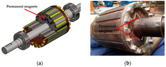 In Ansys Electronics software, the FEM model of the induced-pole LSPMSM was built. The rotor contains quasi-trapezoidal copper bars short-circuited by copper rings which are connected by soldering. The project and manufactured rotor of the induced-pole LSPMSM is presented in Figure 1.