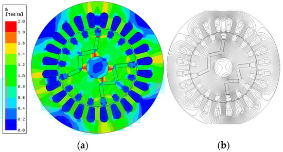 Induced-pole LSPMSM magnetic field analysis: (a) magnetic field density distribution; (b) magnetic field line distribution.