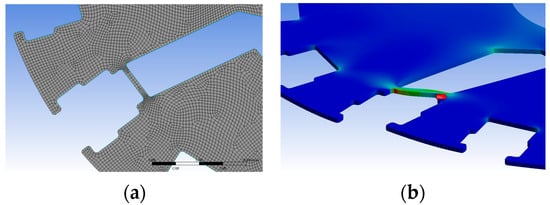 Mechanical stress analysis: (a) mesh in motor FEM model; (b) obtained mechanical stress for Tload = 20Tn and n = 1.2nn.