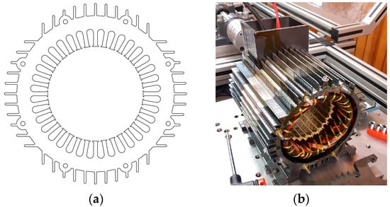 The manufactured induced-pole LSPMSM was built as an enclosure-less construction. The stator sheets contain cooling ribs above the yoke and construction rod holes. The stator sheet and manufactured stator are presented in Figure 4.