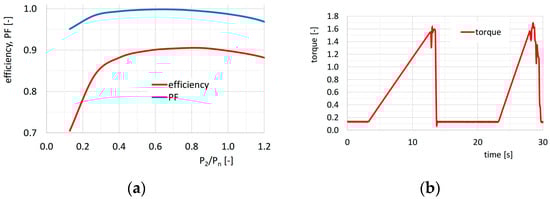 Running properties of induced-pole LSPMSM supplied directly on line: (a) efficiency and PF vs. load power; (b) maximum motor torque investigation.