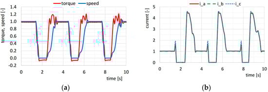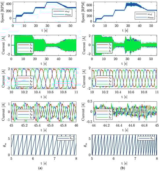In the case of measurement sensor failures, many solutions have been developed to detect and classify faults. The literature describes simple methods based on the analysis of measurement signals [,,], methods based on the object model [,], and more complex solutions based on artificial intelligence [,,]. In the case of fault compensation, the focus is on two types of solutions. The first approach involves the use of the state variable estimators, which replace the faulty sensor programmatically and are categorized as part of analytical compensation. In the literature, applications of many types of estimators can be found: the Sliding Mode [], Extended Kalman Filter [], Unknown Input Observer [] and Luenberger Observer []. Another approach, belonging to hardware compensation methods, is the installation of redundant measurement sensors in the drive system, which can replace a faulty component in the event of a failure []. It is a relatively expensive solution at the production level.