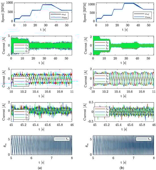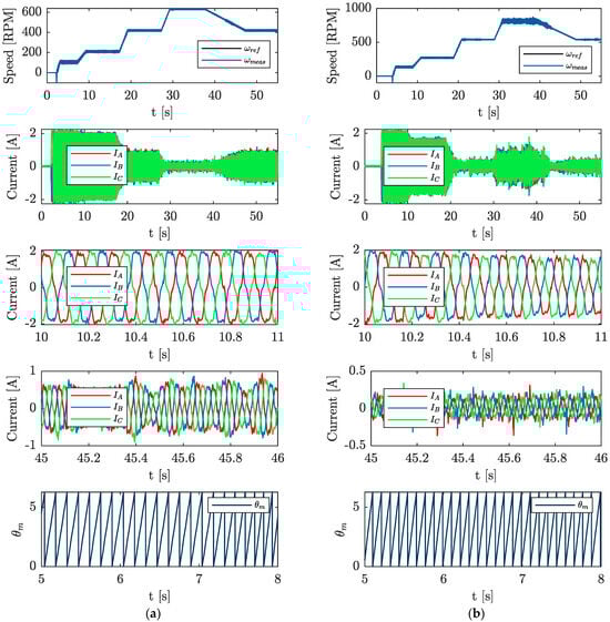 The speed, current, and rotor position waveforms for set speed values of 600 RPM (a) and 800 RPM (b) at the supply voltage of .