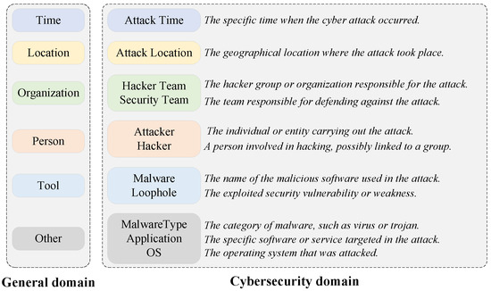 2. Domain-specific entity types: Entity types in the field of cybersecurity exhibit a high degree of specialization. Compared to the general-domain entity types shown in Figure 1, cybersecurity entity types are not only more fine-grained (e.g., “Tool” is refined into “Malware” and “Loophole”) and more specific (e.g., “Time” refers specifically to “Attack Time”), but also include special miscellaneous entity categories such as “MalwareType” and “OS”, which are associated with potential cybersecurity threats. These categories often require domain-specific prior knowledge for accurate differentiation, thus increasing the complexity of extraction.