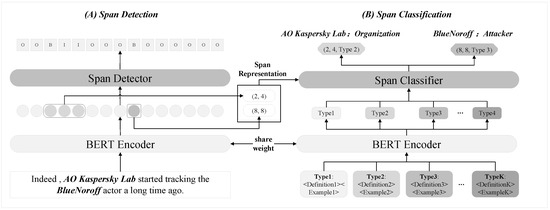 To address the challenges of data scarcity and the incompatibility of general knowledge in the cybersecurity domain, we proposed the CyberDualNER model, which operates in a dual-stage framework: (1) Span Detection: This stage focuses on identifying the start and end positions of all entity spans in the input sequence. To tackle the data scarcity challenge in the cybersecurity domain, CyberDualNER leverages a “pre-training + fine-tuning” paradigm. It pre-trains a generic span detector using large-scale annotated datasets from general domains and fine-tunes it on domain-specific data, enabling effective adaptation to cybersecurity contexts. (2) Span Classification: In this stage, CyberDualNER employs prompt-based templates constructed from entity type descriptions to derive data-agnostic type representations. This approach addresses the representation bias caused by limited entity samples while incorporating domain-specific prior knowledge to enhance the quality of entity type representations. A metric-based learning strategy then calculates similarity scores to classify each detected span into its corresponding entity type. The overall structure of CyberDualNER Model is illustrated in Figure 2.
