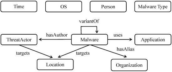 The raw dataset [55] used in this study originates from over 12,000 open-access CTI reports published by several renowned security analysis organizations, including McAfee [56], Symantec [57], and Kaspersky [58]. These reports provide natural language descriptions of the emergence, propagation, attack patterns, and IoC associated with malware. To ensure the quality of the dataset, a data cleaning process was first conducted. Specifically, irrelevant HTML tags, images, and script contents were removed using regular expressions and HTML parsing techniques. Subsequently, manual annotation of the entities and relationships mentioned in the CTI reports was performed using the open-source annotation tool BRAT. Nine types of entities (such as Malware, Application) and seven types of relationships (such as targets, indicates) were identified and labeled. The entities are interconnected through these relationships, providing a comprehensive representation of cyber threats. Part of the ontology on malware is shown in Figure 3. After preprocessing, 5150 annotated sentences remained, which were relevant and complete for the NER task.