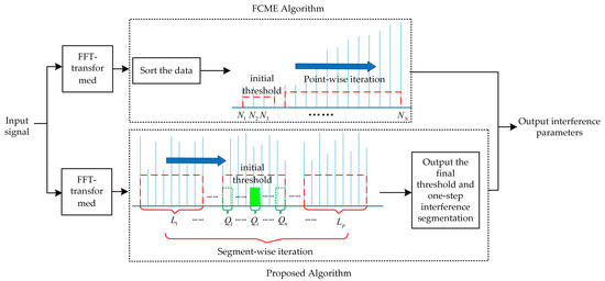 The principle of common frequency-domain interference detection algorithms is as follows: First, the input signal undergoes FFT transformation to convert the time-domain signal into the frequency domain. Then, the initial threshold is calculated, followed by iterations, and finally, the interference parameters are output. This section mainly introduces the working principles of the FCME algorithm and the proposed algorithm. Through comparative analysis, it elaborates on the similarities and differences in the processing steps of initial threshold calculation and follow-up iterations, highlighting the improvements of the proposed algorithm over the FCME algorithm. The principle comparison between the FCME algorithm and the proposed algorithm is illustrated in Figure 1.